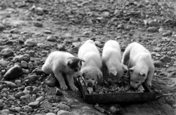 “Gee-whiz! There ain′t room for me.” The Andersons′ puppies vie for a good position around the food dish.