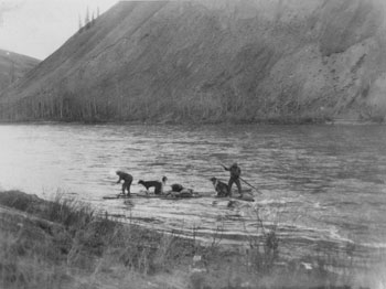 "Un autre de mode de transport nordique : pas très performant du point de vue de la vitesse, mais toujours abordable. Jinks et Pete traversant sur un radeau, mai 1930."